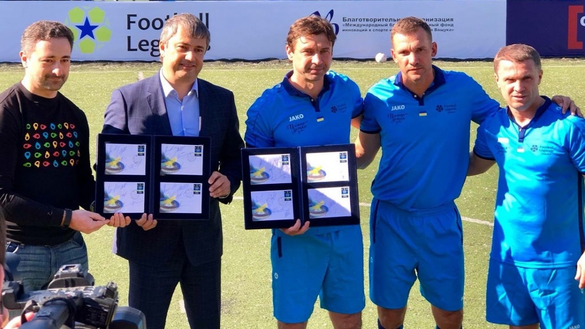 Відбитки на марках спеціальним поштовим штемпелем "Перший день" поставили зірки українського футболу Владислав Ващук, Андрій Шевченко та Сергій Ребров.