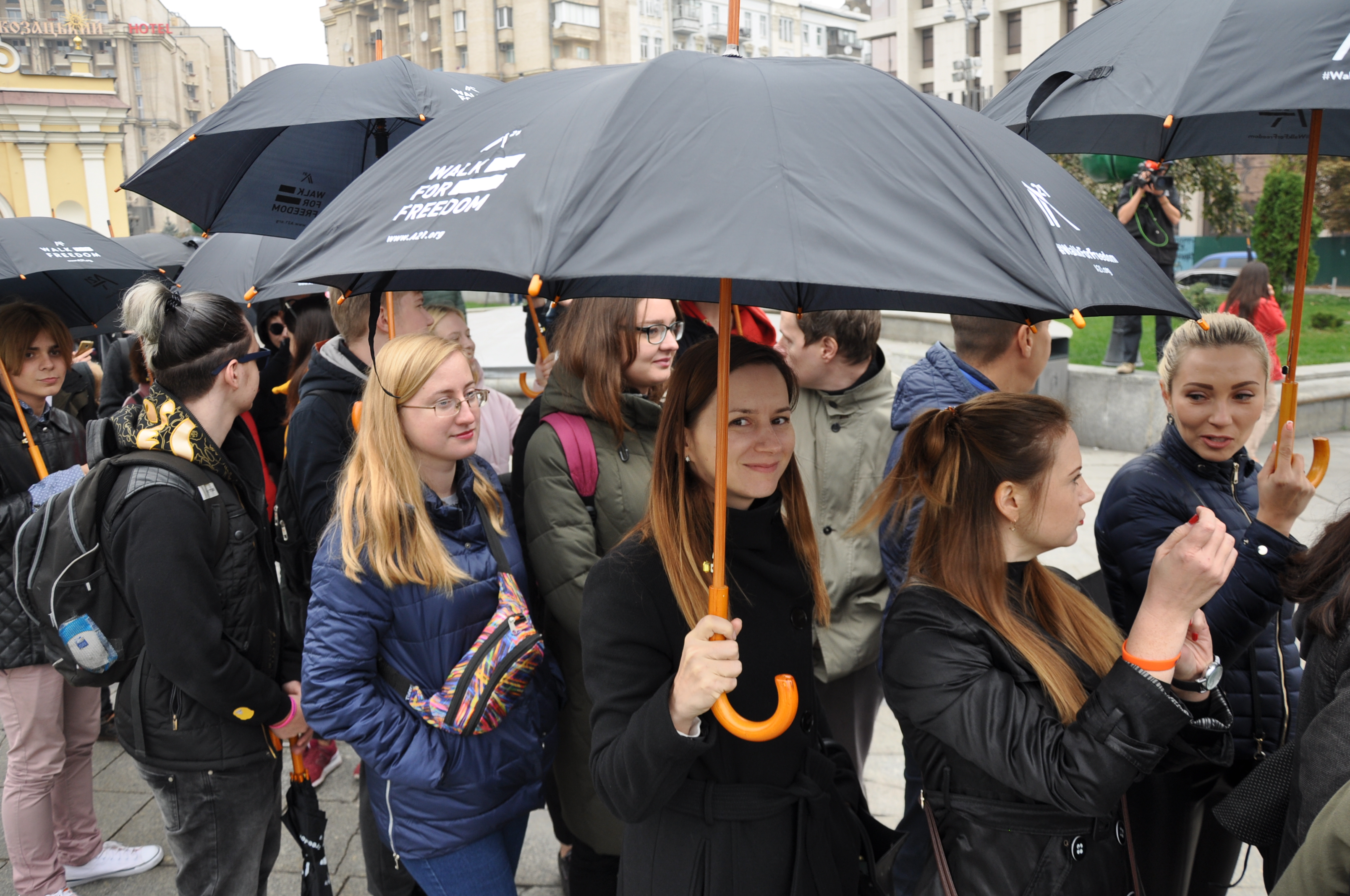 Учасники ходи були одягнені в чорні кольори, а в руках тримали чорні парасольки з логотипом Walk for Freedom.