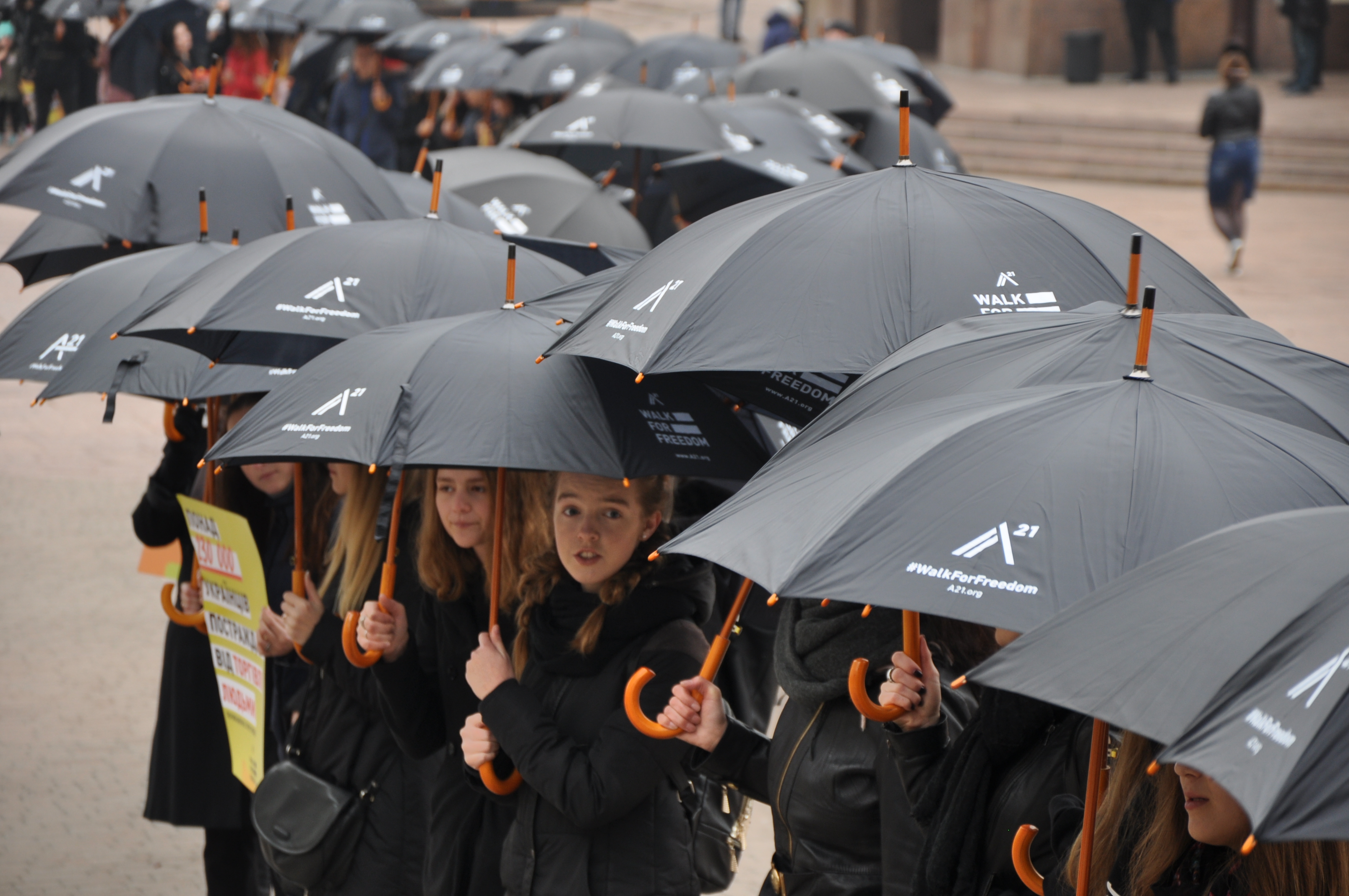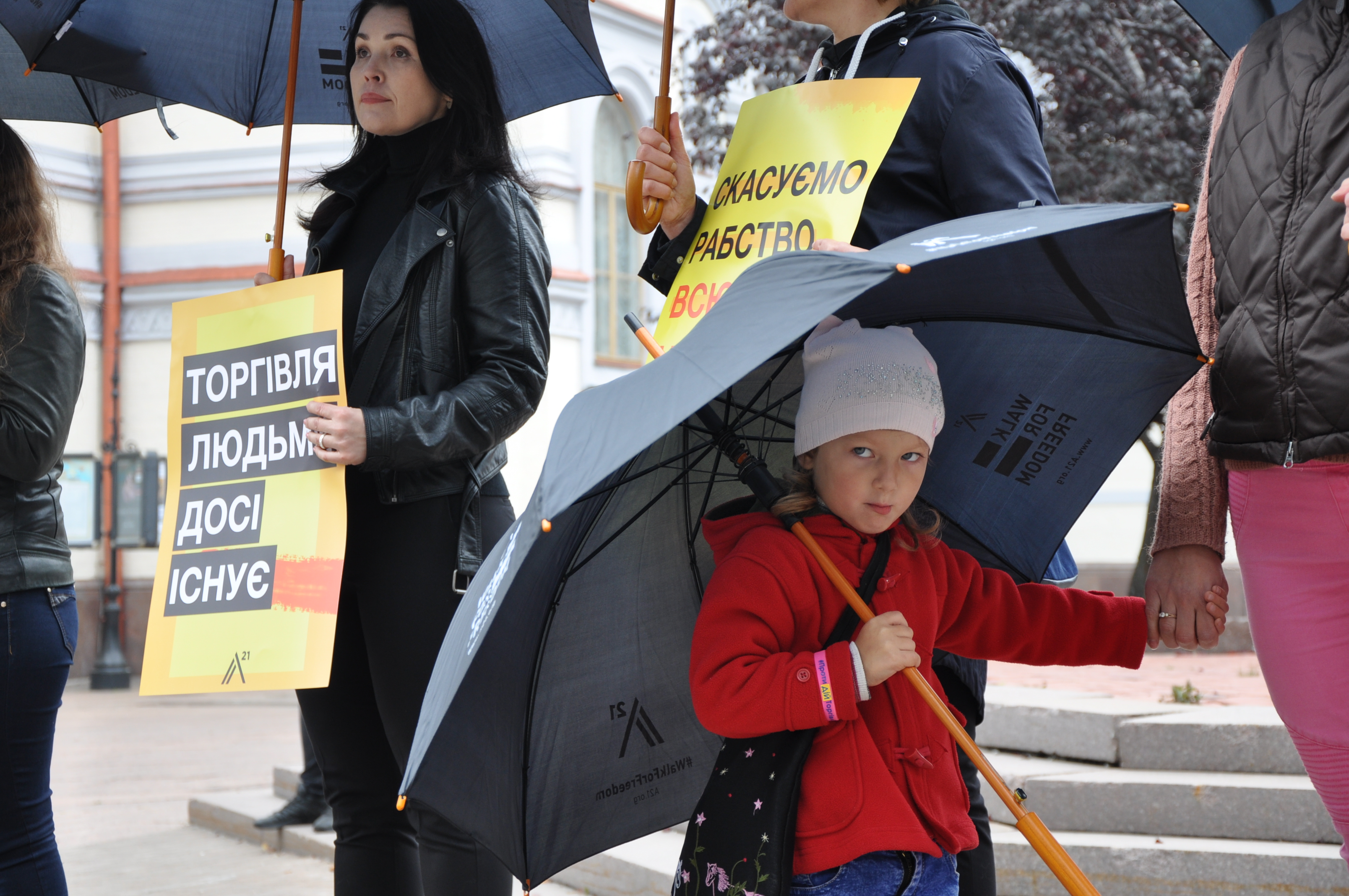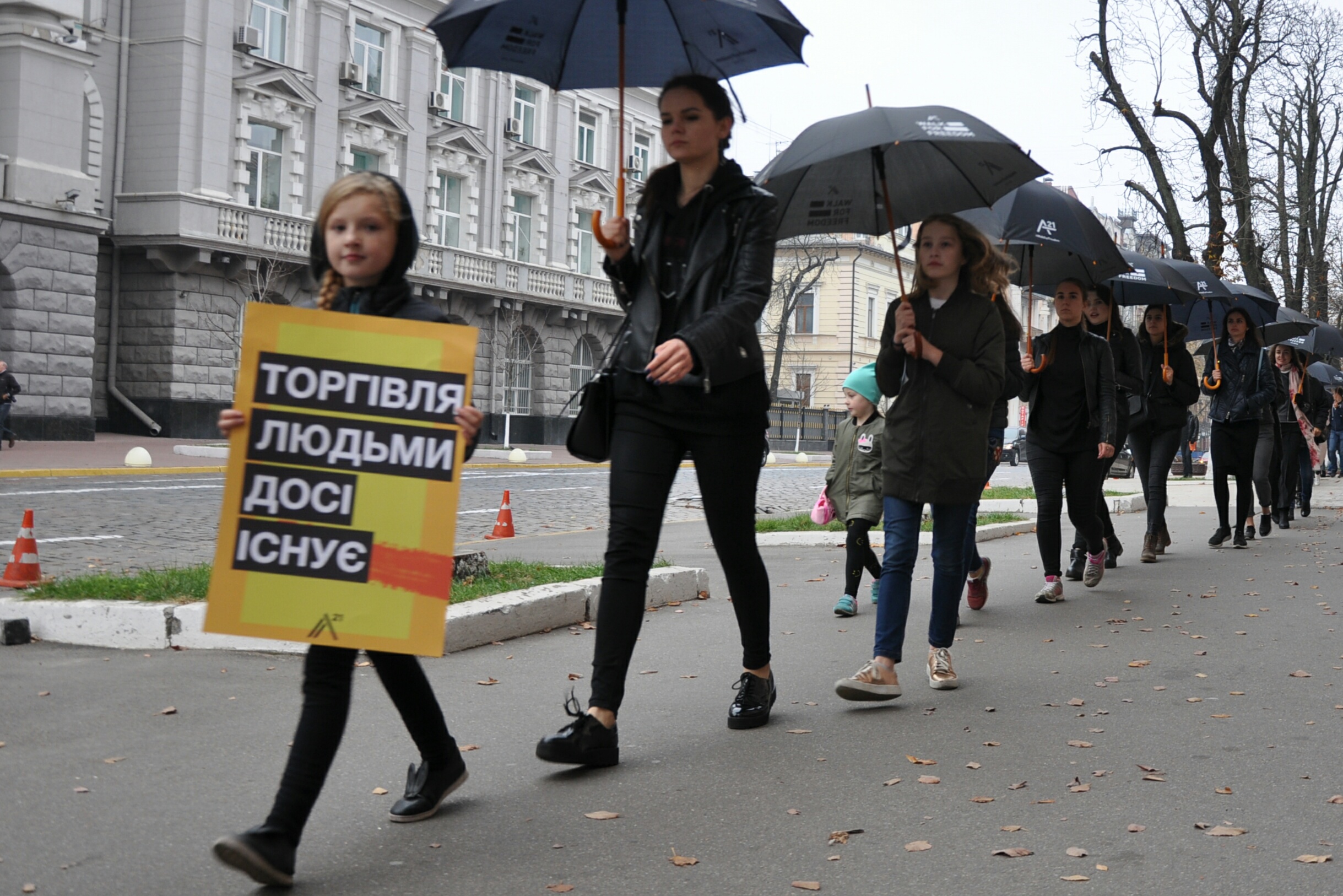 Як роз'яснила координатор програми допомоги потерпілим через торгівлю людьми громадської організації А21 Алла Зоренко, чорний колір одягу і чорні парасольки використовуються для залучення уваги оточуючих до маршу.