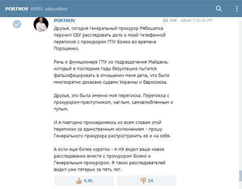 Пізніше Портнов в своєму Telegram підтвердив, що дійсно писав Олександру Божку і вчергове розкритикував дії ГПУ: "Друзі, це була саме моя переписка. Листування з прокурором-злочинцем, нахабним, самозакоханим і тупим. І я повторно приєднуюся до всіх слів цього листування за єдиним винятком — прошу генерального прокурора поширити її і на себе".