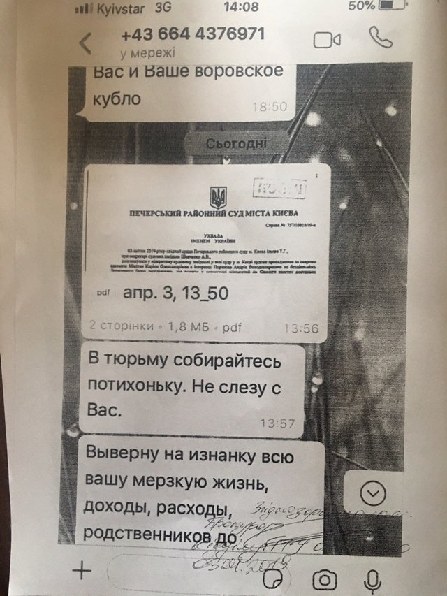 Одразу після того, як він намагався зв’язатися зі свідком у цьому провадженні, на його телефон прийшло повідомлення: "Доброго дня. Бачу, ви занадто активний. Виховні заходи доведеться вжити. Ще раз почую ваше прізвище, буду перетворювати на шматок лайна. З повагою, Портнов".