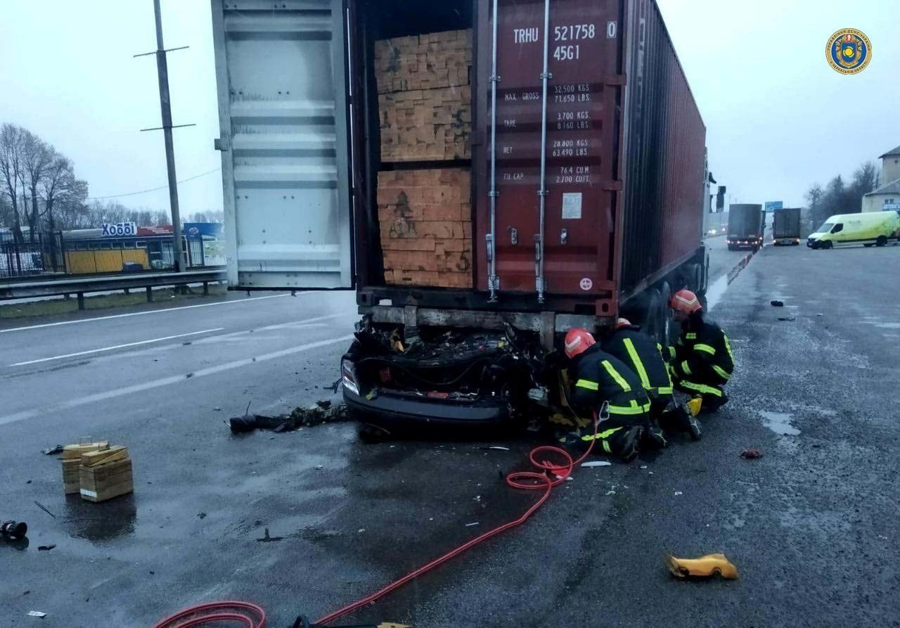 Наслідки ДТП ліквідували рятувальники, повідомили в ДСНС. Вони загасили пожежу і розвантажили причіп, щоб за допомогою автокрана витягнути з-під нього автомобіль.