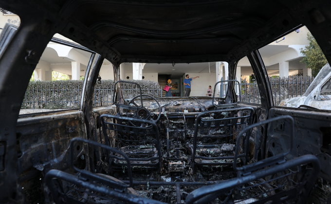 תמונת מצב לשעה 1:00 בסביבות בניין עיריית לוד: הרצפה מלאה באבנים, רימונים ותרמילי כדורי ספוג. האוויר מלא בגז מדמיע ומספר רכבים שרופים בשטח pic.twitter.com/9ZEjVitO2D