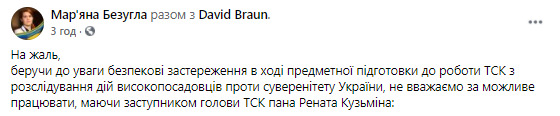 "На жаль, беручи до уваги питання заходів з безпеки під час предметної підготовки до роботи ТСК з розслідування дій посадових осіб проти суверенітету України, не вважаємо за можливе працювати, маючи заступником голови ТСК пана Рената Кузьміна", - написала Безугла.