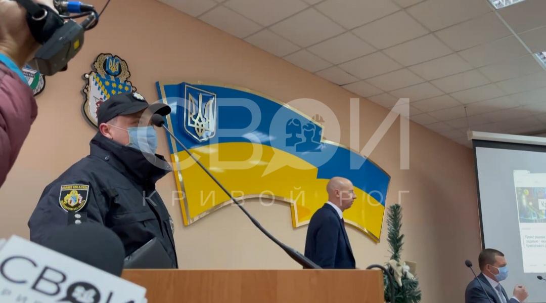 У цей час один із співробітників міської поліції, що спостерігали за подіями, підійшов до трибуни і повідомив присутніх, що до поліції надійшло повідомлення про мінування. Людей попросили залишити будівлю. Незважаючи на вимогу поліцейських, голова Криворізької районної ради Віктор Мудрий оголосив сесію відкритою.