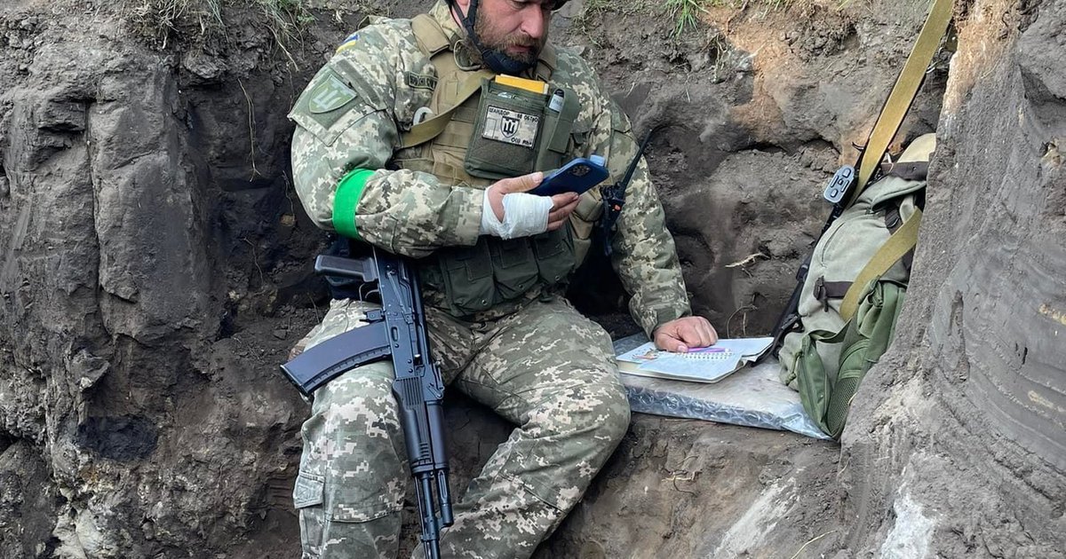 Професор Ужгородського національного університету Федір Шандор читає лекцію студентам, сидячи в окопі.