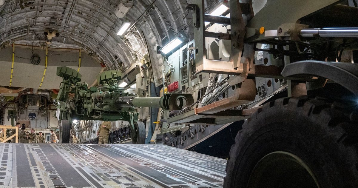 "155-мм гаубиці M777, що буксируються, закріплені для транспортування в Україну літаками Повітряних сил США в рамках допомоги США в сфері безпеки", - йдеться у повідомленні.