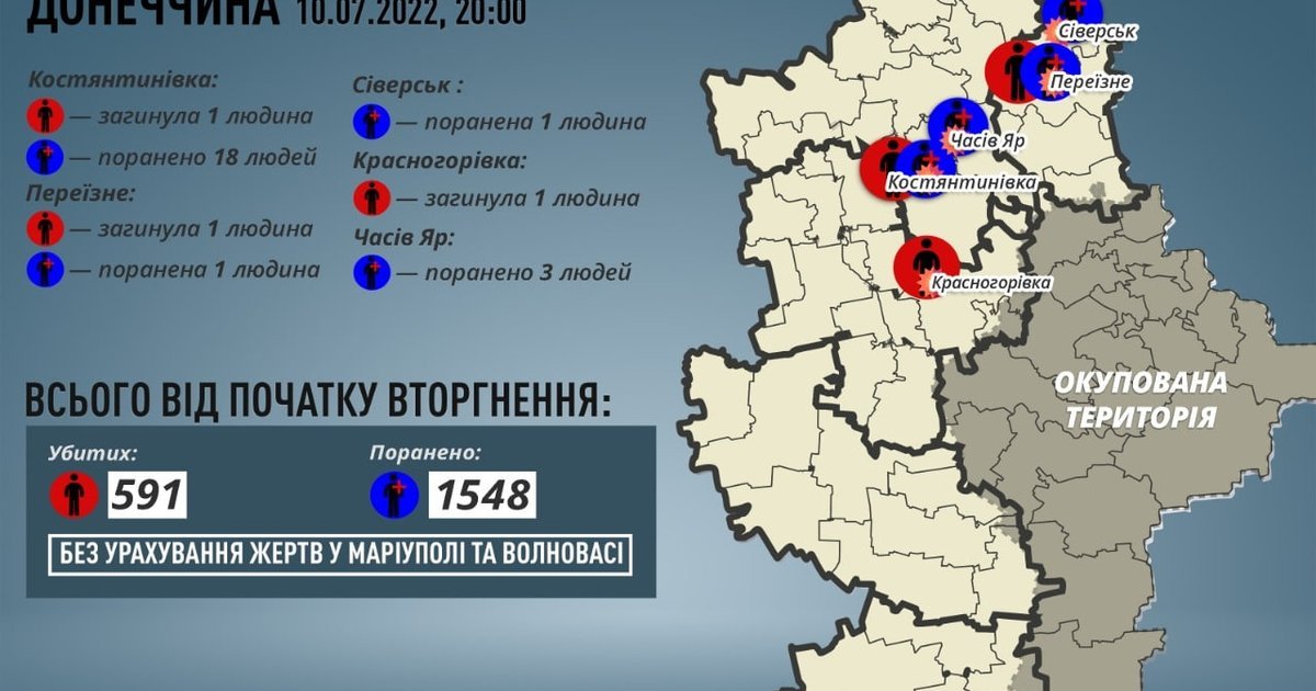 "За 9 липня росіяни вбили 3 мирних жителів Донеччини: у Костянтинівці, Красногорівці та Переїзному. Ще 23 людини отримали поранення. Наразі неможливо встановити точну кількість жертв у Маріуполі та Волновасі", - йдеться у повідомленні.