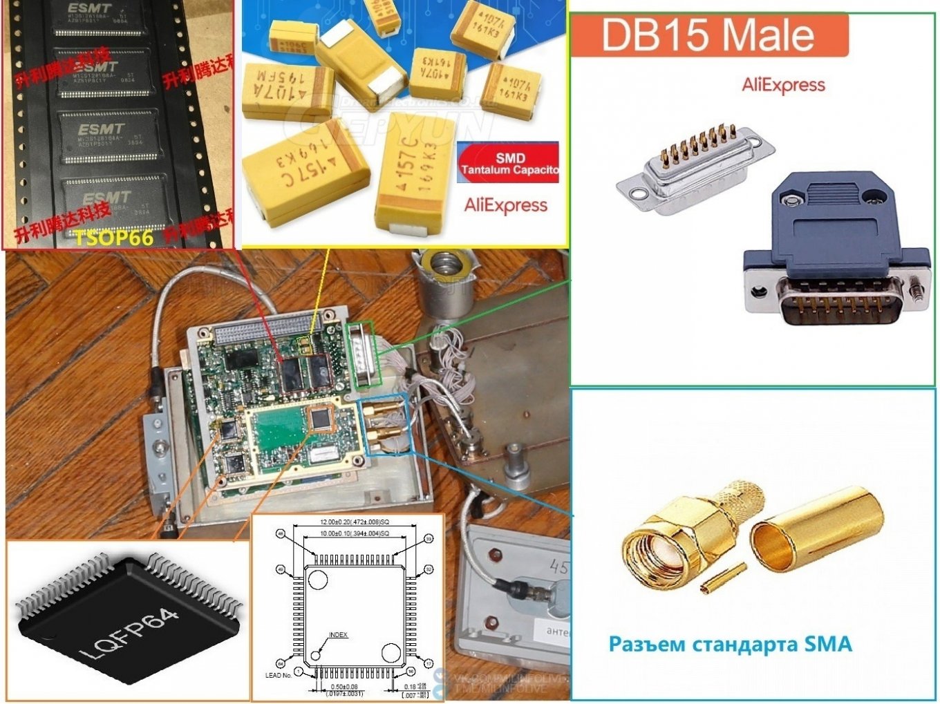 Головний блок містить дві мікросхеми у корпусі TSOP66, три мікросхеми у корпусі LQFP64, танталові SMD конденсатори, роз'єми DB15 та SMA. всі ці компоненти можна закупити на AliExpress. Із наявних аналогів у РФ лише LQFP64 - К1986ВЕ92QI від "Миландр".