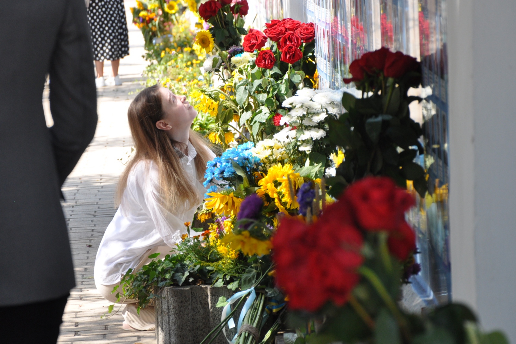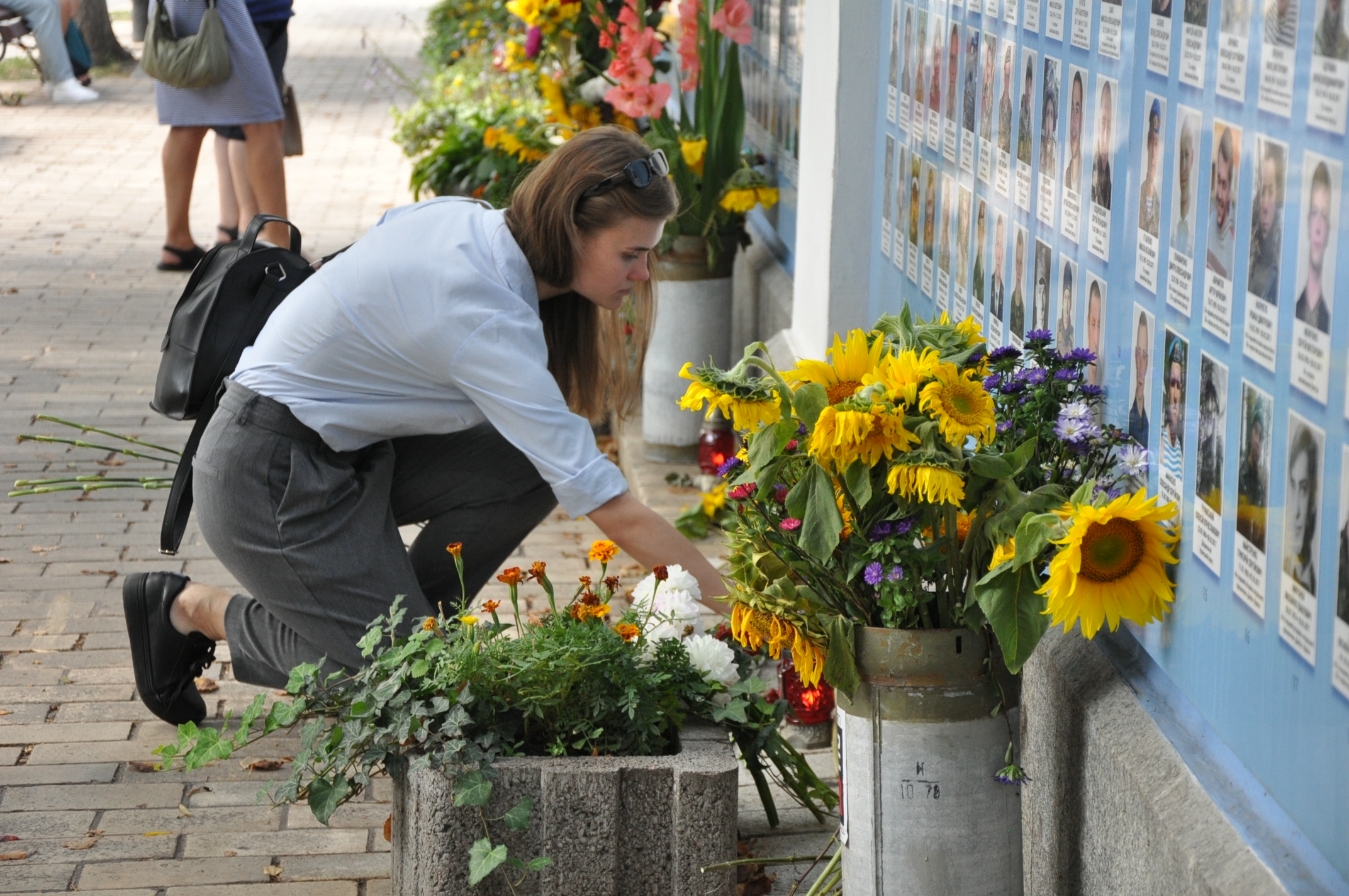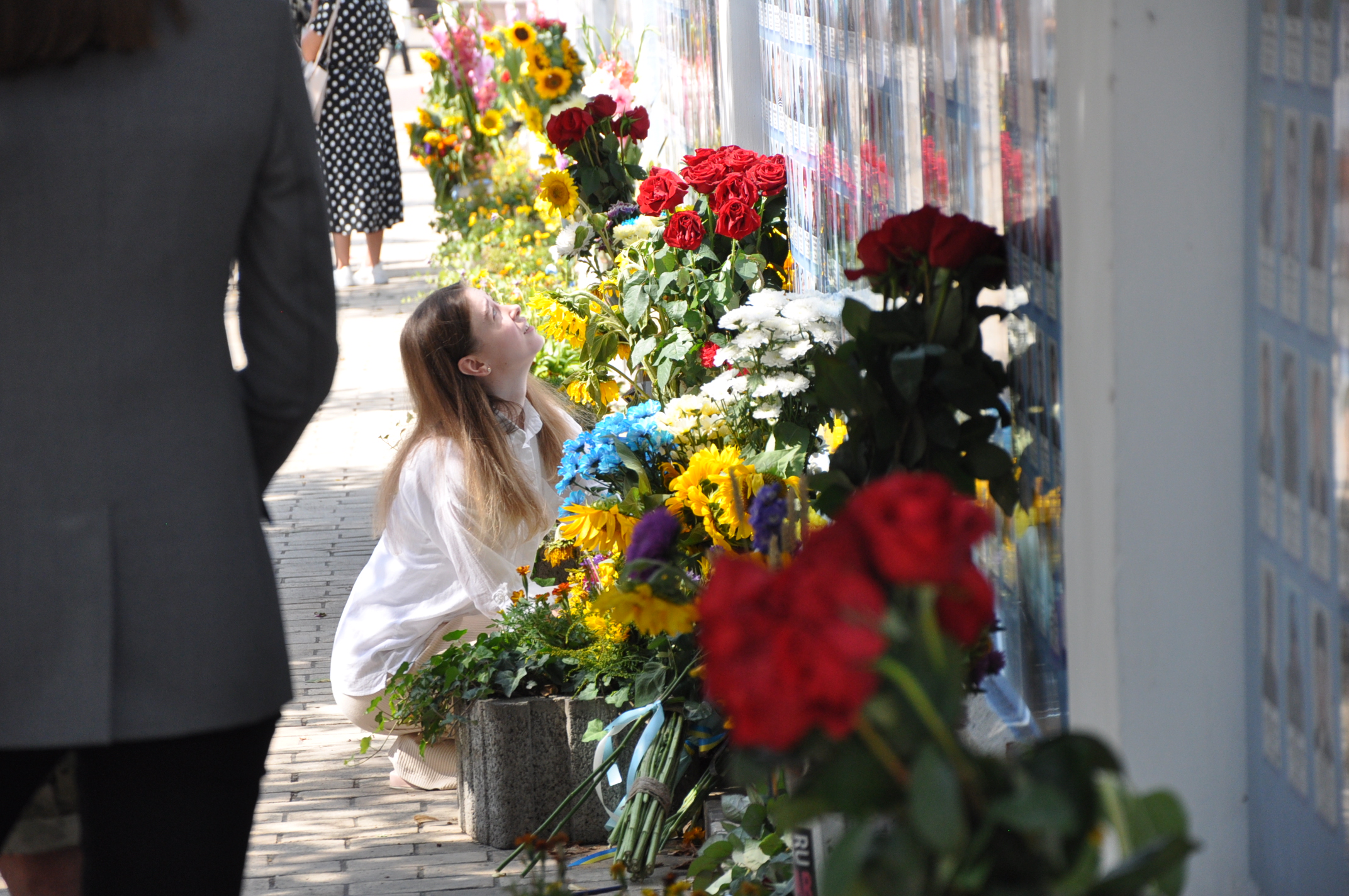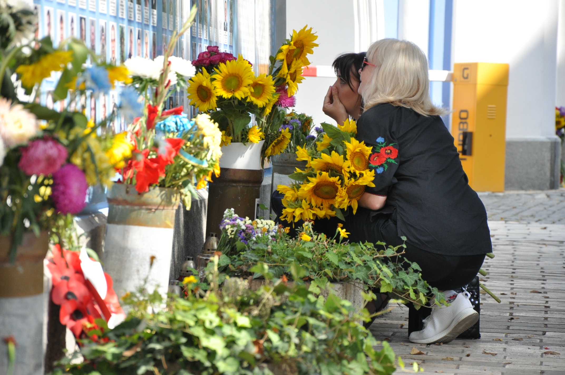 Так, до Стіни пам'яті загиблих героїв поблизу Михайлівського Золотоверхого собору люди несли соняхи та лампадки.
