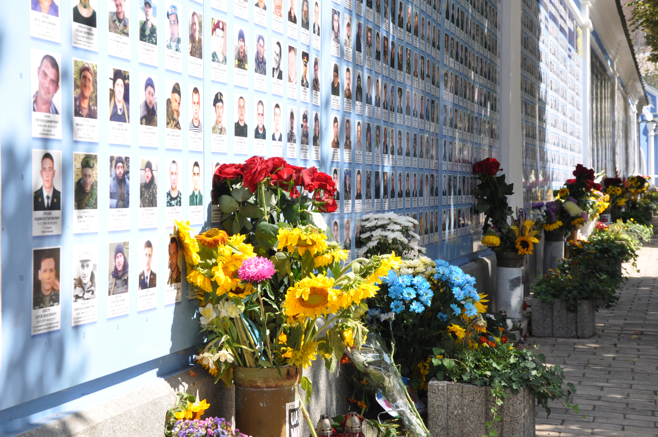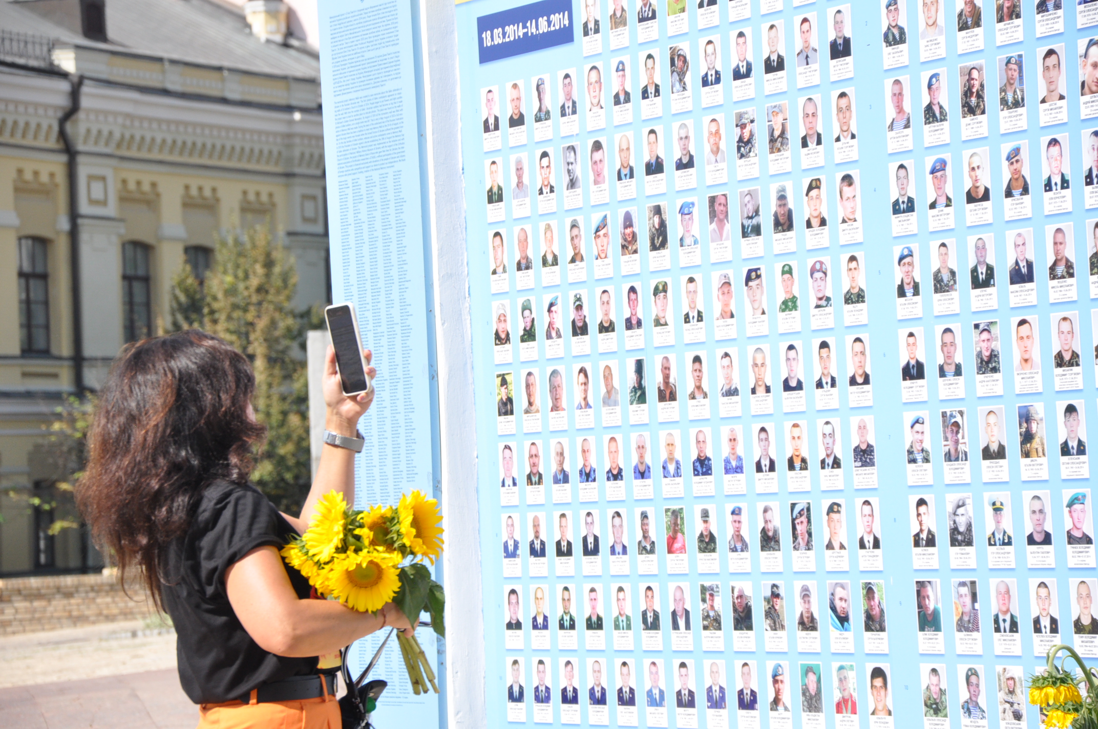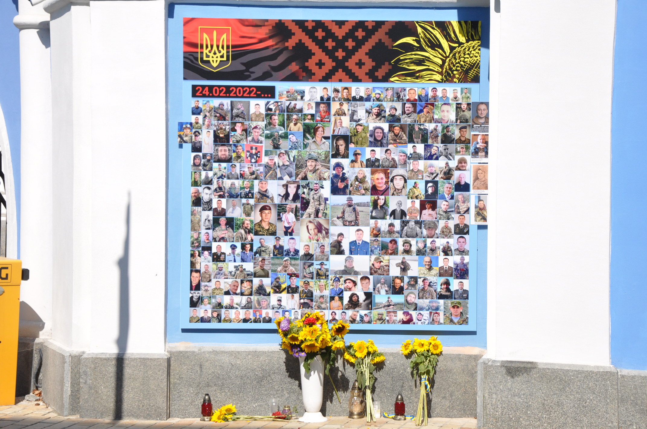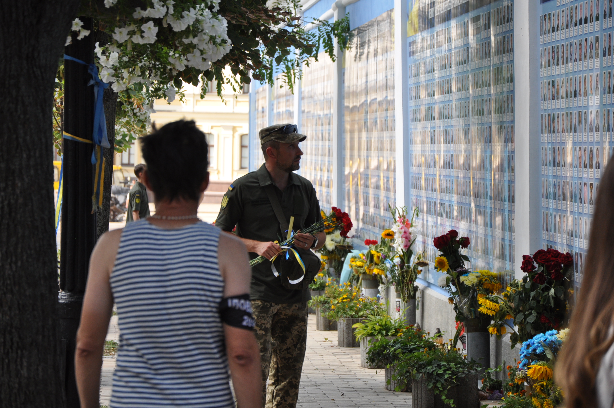 Так, до Стіни пам'яті загиблих героїв поблизу Михайлівського Золотоверхого собору люди несли соняхи та лампадки.