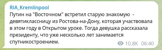 На запитання, чи буде Росія допомагати КНДР будувати супутники, Путін відповів: "Ми тому і приїхали на космодром "Восточный".