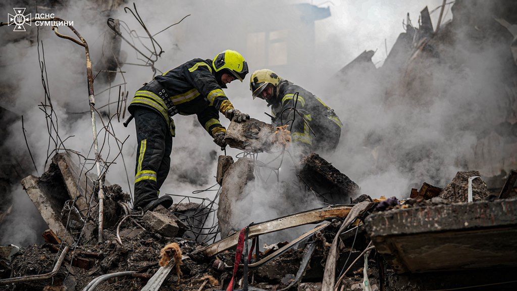 "Впродовж чотирьох днів працюючи в Сумах на місці ворожого удару, рятувальники провели колосальну роботу. В перші години фахівці ДСНС врятували 10 мешканців зруйнованої багатоповерхівки, з яких п’ятьох деблокували з-під завалів. Також з-під завалів було деблоковано тіла трьох загиблих людей", - йдеться в повідомленні.
