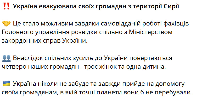 Головне управління розвідки Міністерства оборони України та Міністерство закордонних справ спільно евакуювали з території Сирії чотирьох українських громадян – трьох жінок і одну дитину.