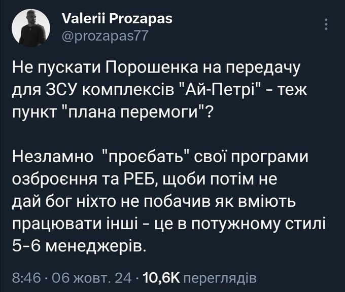 Виявляється, Порошенко пропонував ОВА Покровська допомогу з фортифікаціями - Банкова наказала не приймати ніякої допомоги від нього. Те саме з Охматдитом, музеєм Шухевича. Тварі зелені самі нічого не роблять і іншим не дають. Скільки ще українці будуть терпіти цих вбивць?