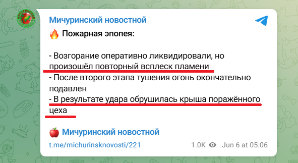 У ніч на 6 червня українські безпілотники атакували завод "Прогрес" у Мічурінську Тамбовської області.