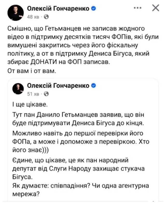 Відрижка і незмінний помічник топового агента фсб рф сівковича даніла гетманцев, який тупо знищує бізнес, захищає бігуса, який на замовлення фсб рф, де працює діючим офіцером брат його дружини, виконував «розслідування» так званих свинарчуків, перекривши цим розслідуванням поставки клістронів для ППО ЗСУ, і одночасно надав медійний привід для поповнення кількості лайна в черепних коробках мудрого народу.