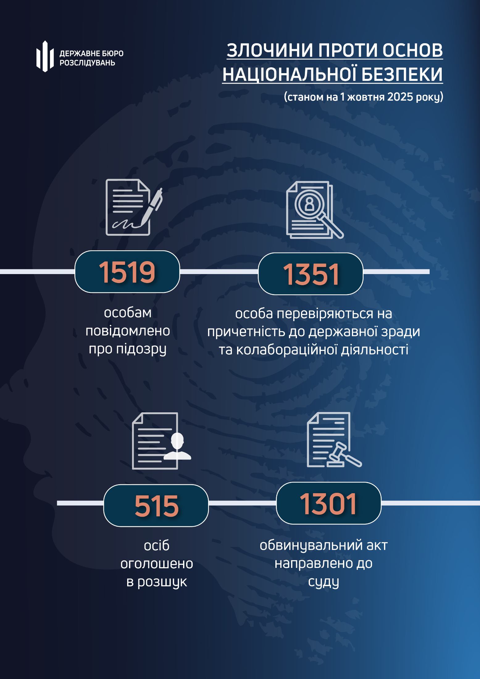 Станом на початок жовтня 2025 року 1 519 особам повідомлено про підозру, 515 — оголошено в розшук, 1 351 особу перевіряють на причетність до зради, а 1 301 обвинувальний акт вже скеровано до суду.