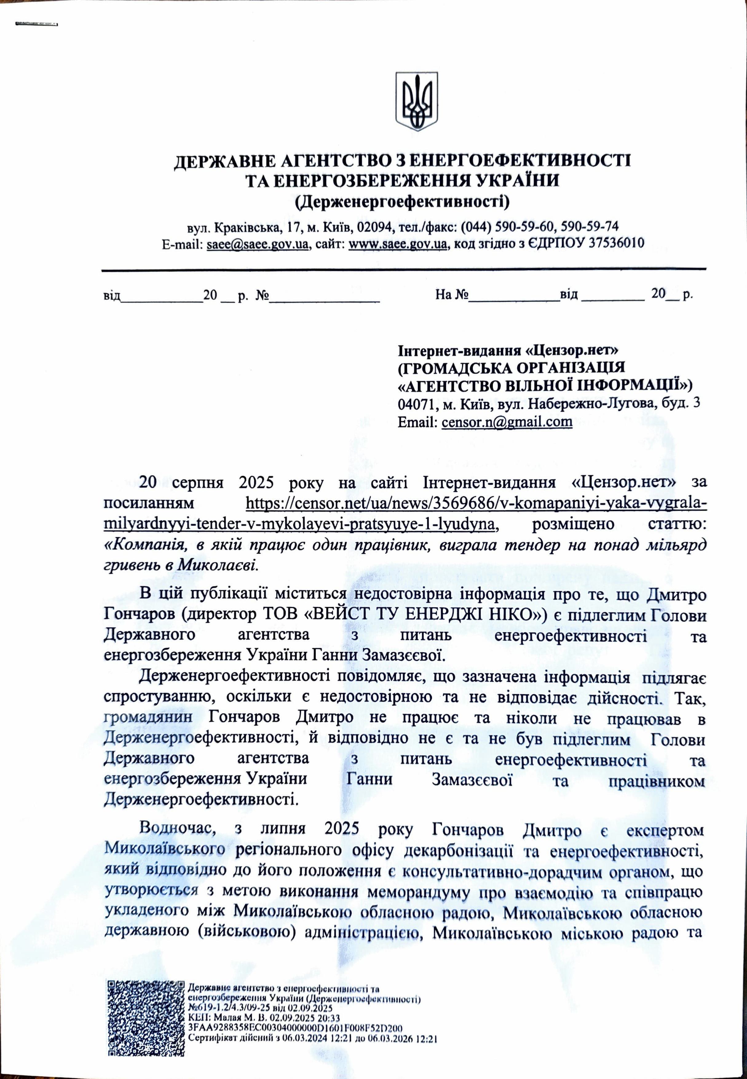 Агентство з питань енергоефективності та енергозбереження спростовує інформацію, розміщену зокрема на сайті Цензор.НЕТ, про те, що Дмитро Гончаров - директор та єдиний працівник компанії "Waste To Energy Niko", яка виграла конкурс на сортування сміття з бюджетом 1,25 млрд у Миколаєві, є нібито підлеглим голови Агентства з питань енергоефективності та енергозбереження Ганни Замазєєвої.