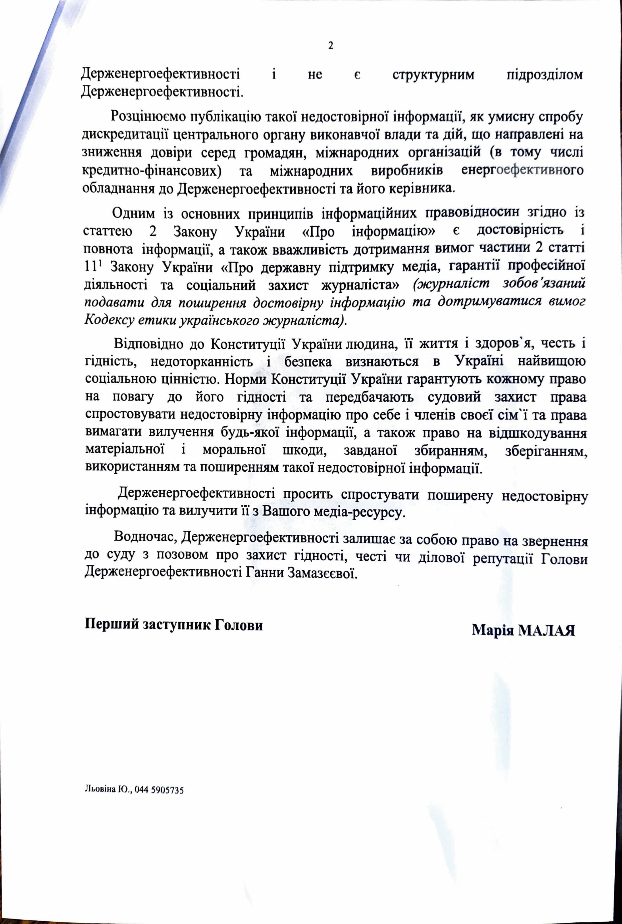 Агентство вимагає спростувати недостовірну інформацію, та запевняє, що вона не відповідає дійсності. Як зазначається у документі, Дмитро Гончаров не працює та ніколи не працював в Держенергоефективності, та відповідно ніколи не був підлеглим Ганни Замазєєвої чи працівником Держенергоефективності.