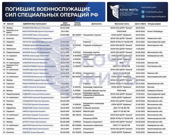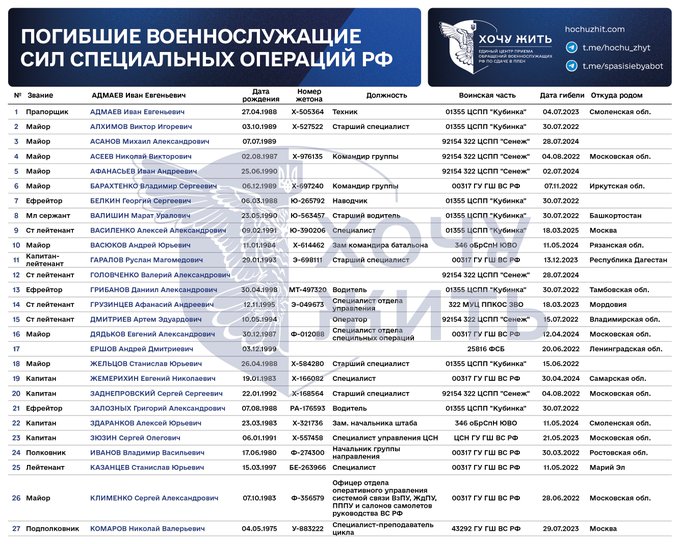 Нам известно о гибели как минимум 58 специалистов "ССО", "ГРУ" и "ФСБ" на территории Украины. Кроме того, установлены имена более двух тысяч военнослужащих бригад специального назначения "ГУ ГШ ВС РФ", список которых будет опубликован отдельно."