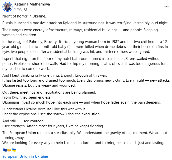 Посол ЄС Матернова провела ніч на підлозі ванної кімнати під час обстрілу: Досить цієї війни. ФОТО