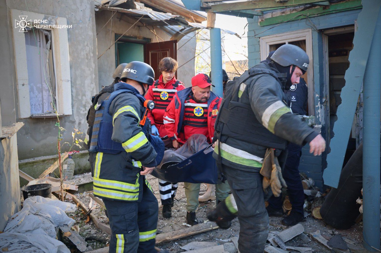 За даними ДСНС, у Чернігові через удар безпілотників пошкоджено чотири житлові будинки. Постраждалого рятувальники разом із медиками доставили до карети швидкої допомоги.