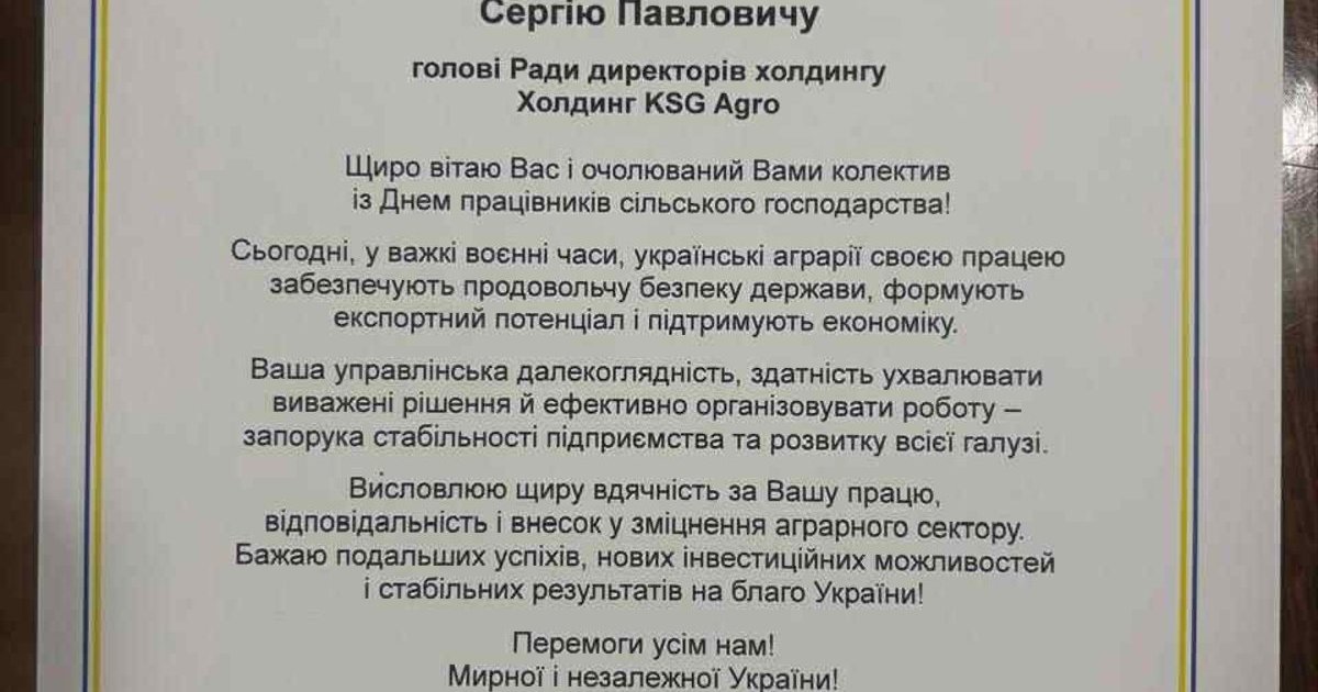 "Сьогодні у важкі воєнні часи українські аграрії своєю працею забезпечують продовольчу безпеку держави, формують експортний потенціал та підтримують економіку. Ваша управлінська далекоглядність, здатність ухвалювати виважені рішення й ефективно організовувати роботу - запорука стабільності підприємства та всієї галузі. Висловлюю щиру вдячність за вашу працю, відповідальність та внесок у зміцнення аграрного сектору. Бажаю подальших успіхів, нових інвестиційних можливостей і стабільних результатів на благо України", - зазначено у листі міністра.