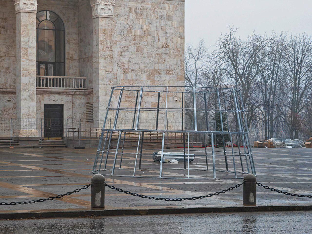 У Маріуполі біля Драмтеатру, де загинули мирні містяни, росіяни почали монтувати ялинку. ФОТОрепортаж