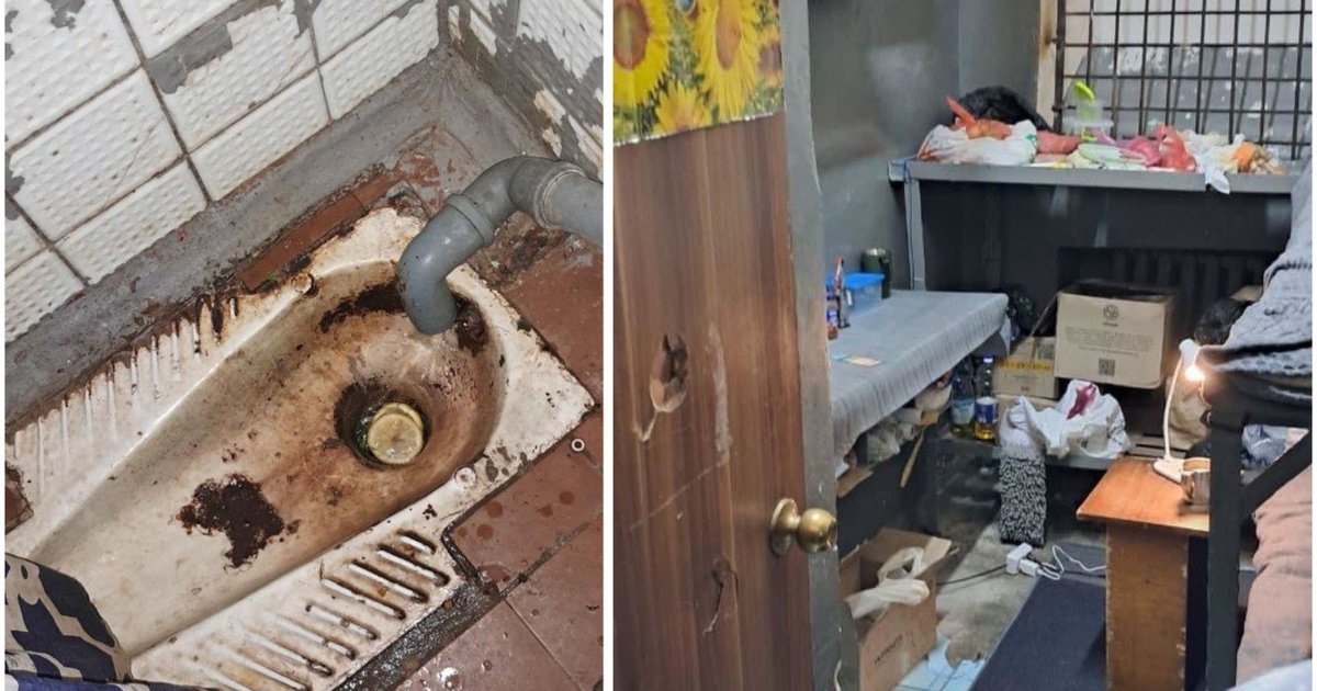 На світлинах видно невелике приміщення з вузькими ліжками, старими речами та розкиданими побутовими предметами, а також забруднений туалет із сильно зношеним покриттям, пошкодженою плиткою, повідомляє Цензор.НЕТ.
