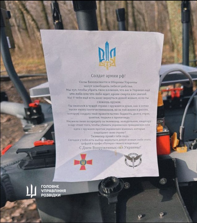 "До Дня Збройних Сил України воїни підрозділів активних дій ГУР МО України провели інформаційно-роз’яснювальну роботу з військовослужбовцями армії агресора", - йдеться в повідомленні.