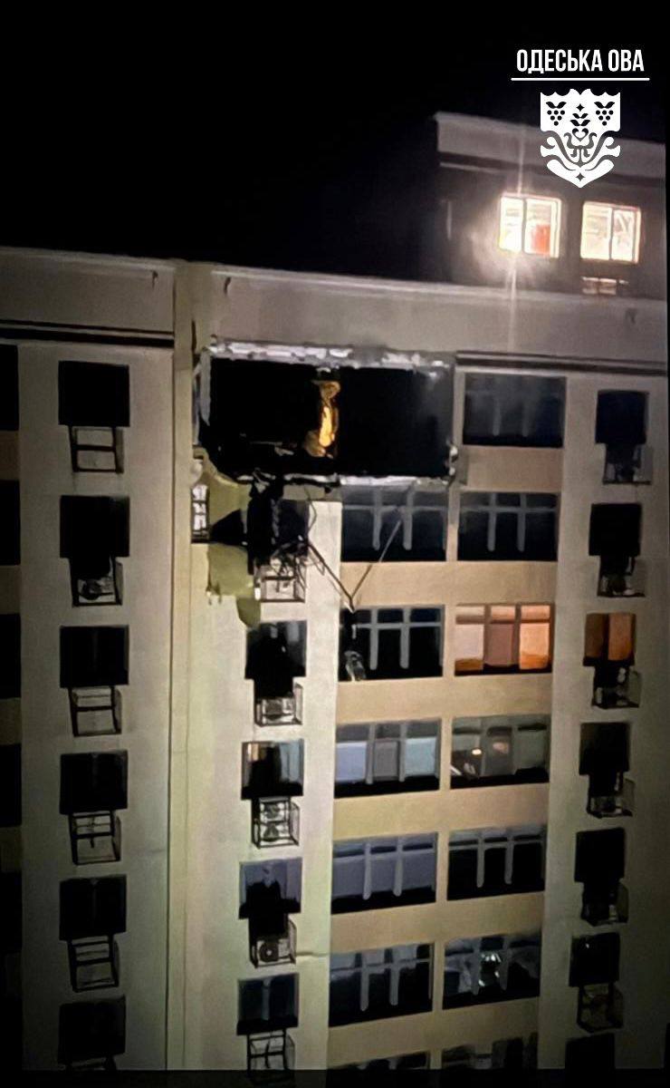 "В Одеському районі безпілотник влучив у багатоповерховий житловий будинок. Пошкоджено дві квартири, фасад будівлі, скління, приватний транспорт, припаркований поруч.