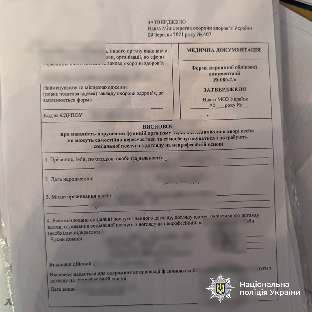 Було задокументувано десятки епізодів фальсифікації медичних довідок та документів про нібито необхідність догляду за людьми з інвалідністю. Саме на підставі цих паперів чоловіки призовного віку отримували відстрочки від мобілізації або достроково припиняли військову службу.