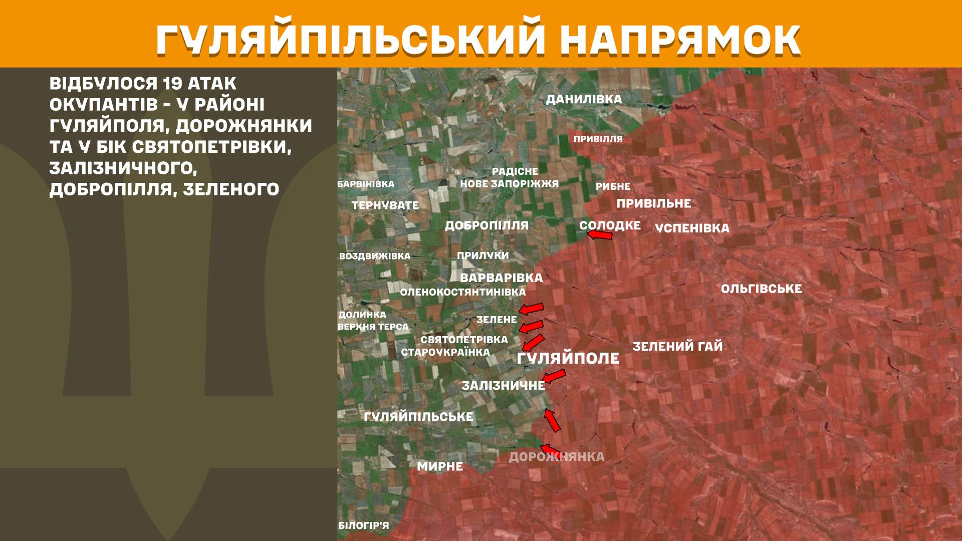 На Гуляйпільському напрямку відбулося 19 атак окупантів - у районі Гуляйполя, Дорожнянки та у бік Святопетрівки, Залізничного, Добропілля, Зеленого.