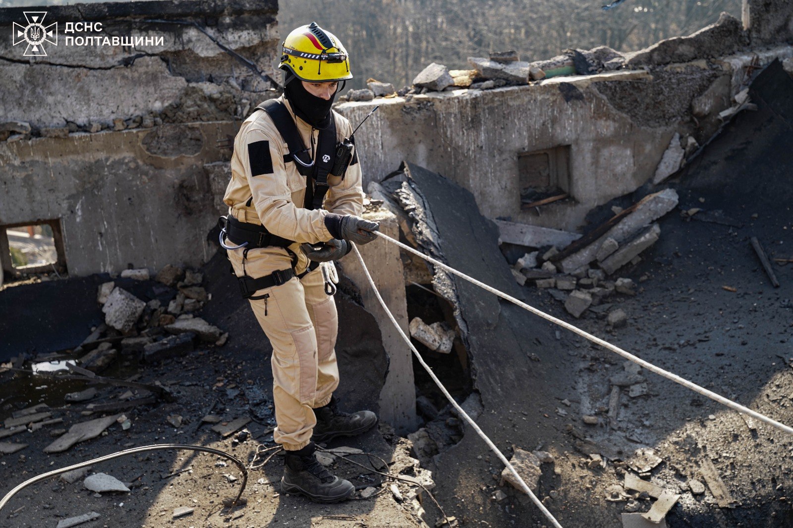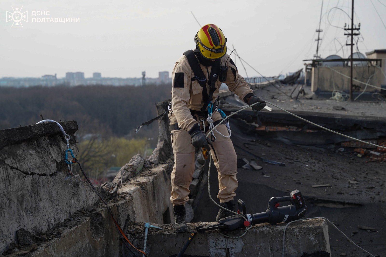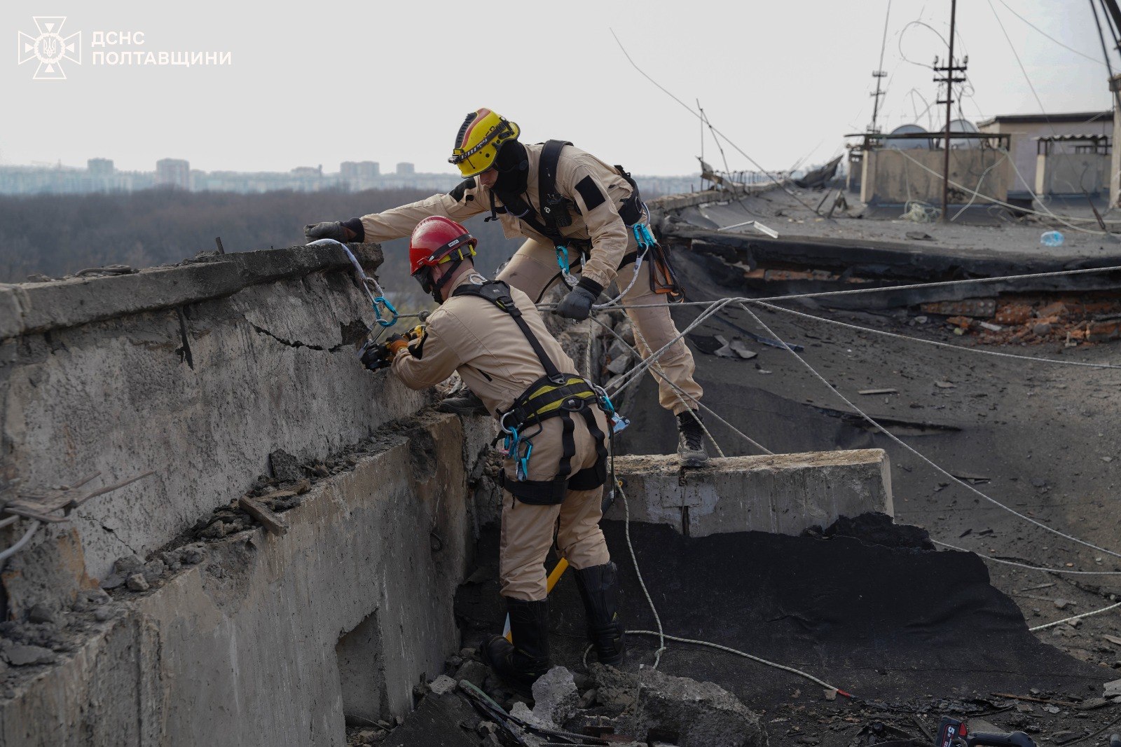 У Полтаві триває ліквідація наслідків удару російських окупантів по багатоповерхівці, працюють рятувальники-верхолази.