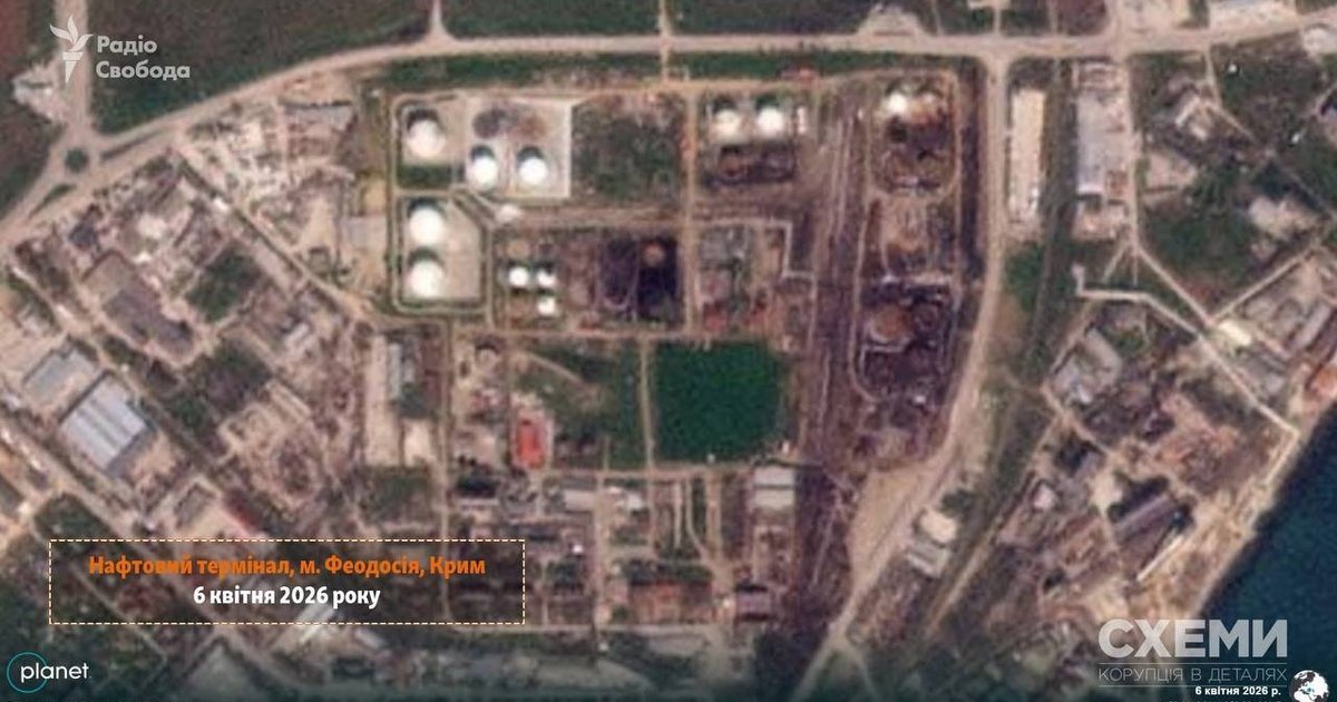 На знімках Planet Labs за 8 квітня, які є у розпорядженні журналістів "Схем" (Радіо Свобода), видно пожежу та клуби диму на території ключової нафтобази окупованого Росією Криму – "Морський нафтовий термінал" у Феодосії. Аналіз супутникових зображень за попередні дні вказує на те, що горять щонайменше два резервуари, вцілілі після попередніх атак Сил оборони у жовтні 2025 року.