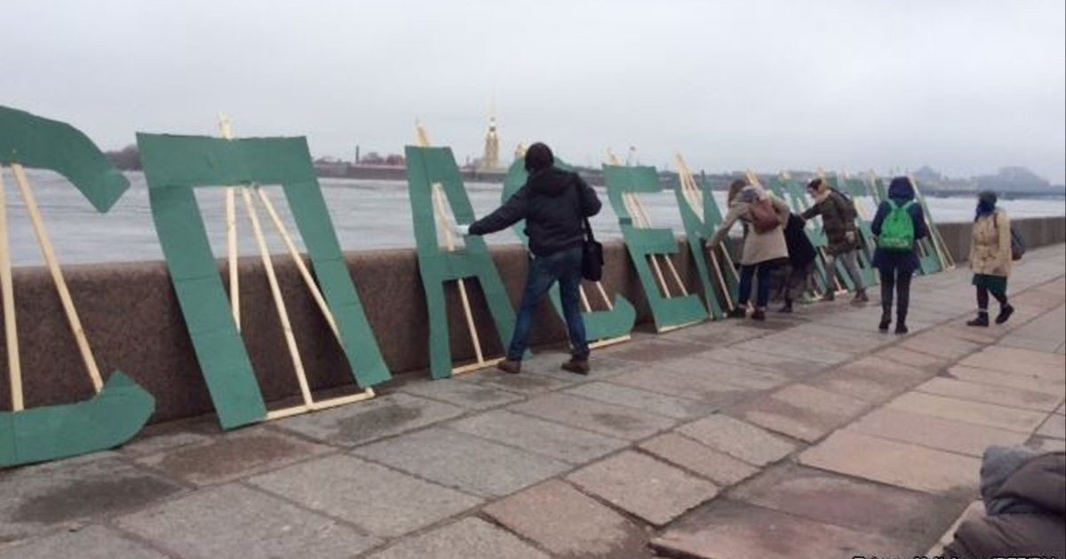 Про це повідомляє Цензор.НЕТ із посиланням на Радіо СвободаНадпис складався з окремих букв в людський зріст, кожну з яких активісти прикріпили до окремої дерев'яної підставки. Вони майже нікому не повідомили заздалегідь про свою акцію і працювали дуже швидко, мабуть, побоюючись, що її можуть зірвати. Але їм ніхто не завадив, окрім вітру з Неви.