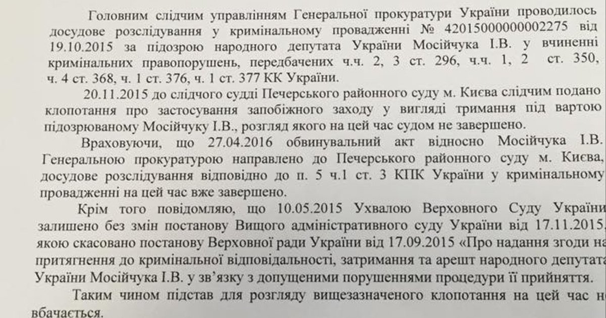 ГПУ відкликала клопотання про арешт Мосійчука. ДОКУМЕНТ