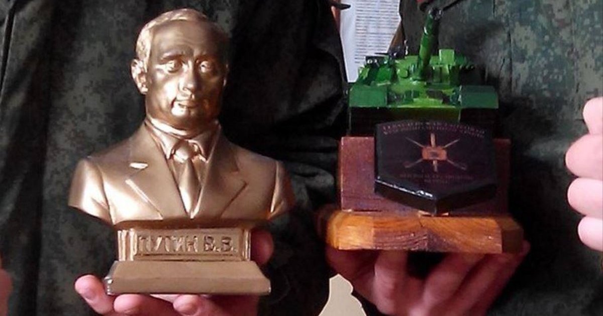 Об этом сообщил волонтер-расследователь InformNapalm Ираклий Комахидзе, который опубликовал фотографию одного из российских военнослужащих, на которой солдаты стоят с призами в руках, "деревянным танчиком" (как он назван в комментарии автора публикации) и бюстом Путина, передает Цензор.НЕТ.