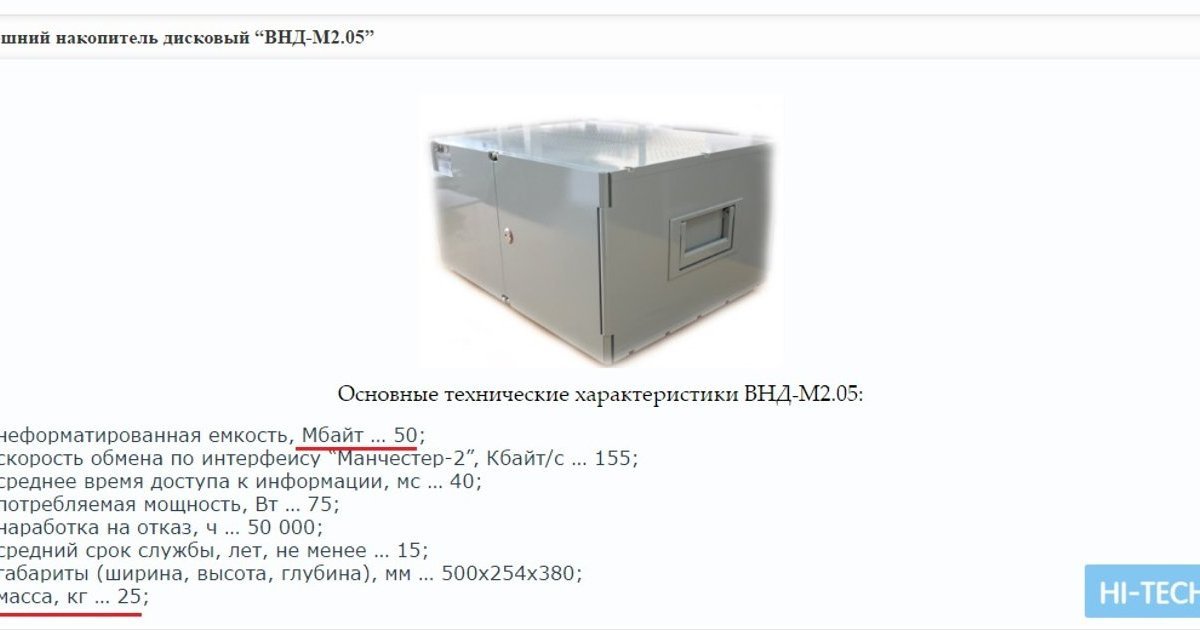 Російське підприємство "НДІФ і ВТ" виробляє зовнішній жорсткий диск об'ємом 50 мегабайт, вагою 25 кг і вартістю майже чотири мільйони рублів (близько 60 тисяч доларів).