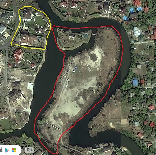 Острів з'єднується мостом з берегом (на фото - виділено жовтим), де розташований другий, уже побудований, маєток Юлії Льовочкіної на ділянках площею 0,42 га.