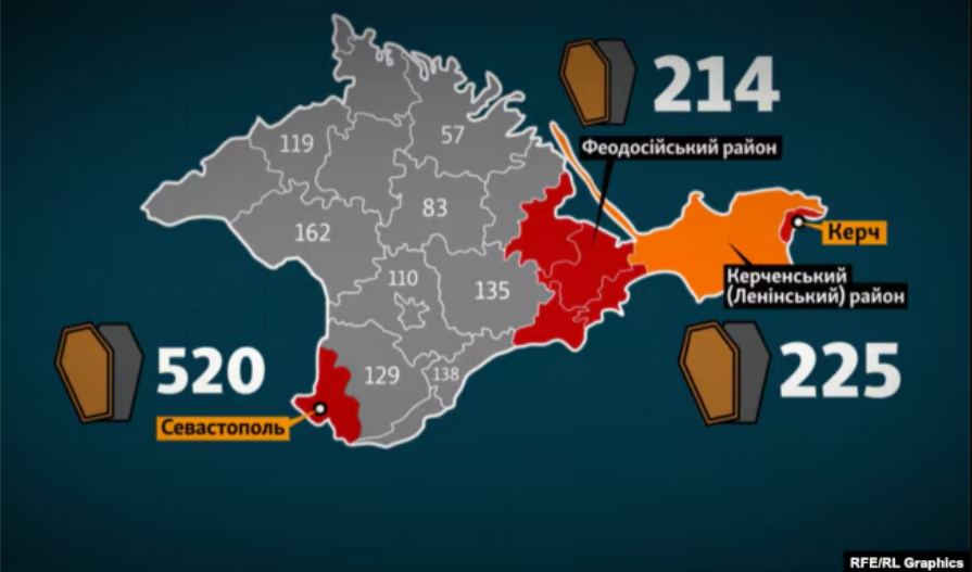 - Згідно з даними, які вдалося встановити, більша частина некрологів припадає на Севастополь – 520 осіб, на другому місці Керченський (Ленінський) район – 225 похоронок.