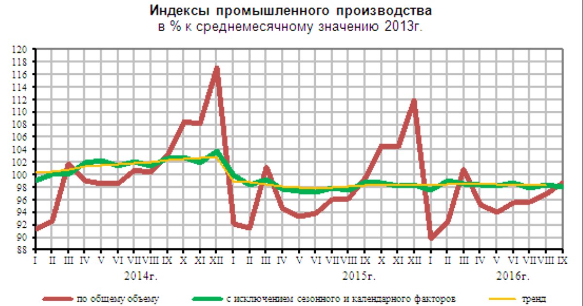 Як повідомляє Цензор.НЕТ із посиланням на Федеральну службу державної статистки, індекс промислового виробництва в січні-вересні 2016 року порівняно із січнем-вереснем 2015 р. становить 100,3%, у вересні 2016 року порівняно з вереснем 2015 р. - 99,2%, порівняно із серпнем 2016 року - 101,8%.