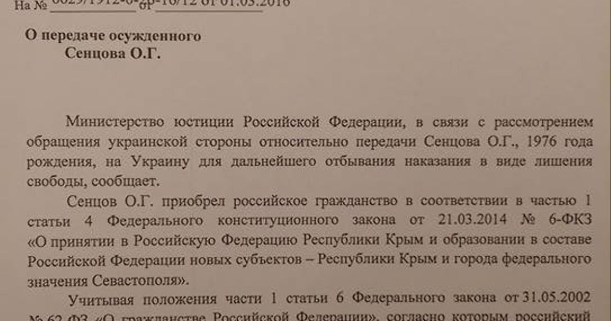 Росія відмовила Україні в передачі Сенцова, - заступник голови Мін'юсту. ДОКУМЕНТ