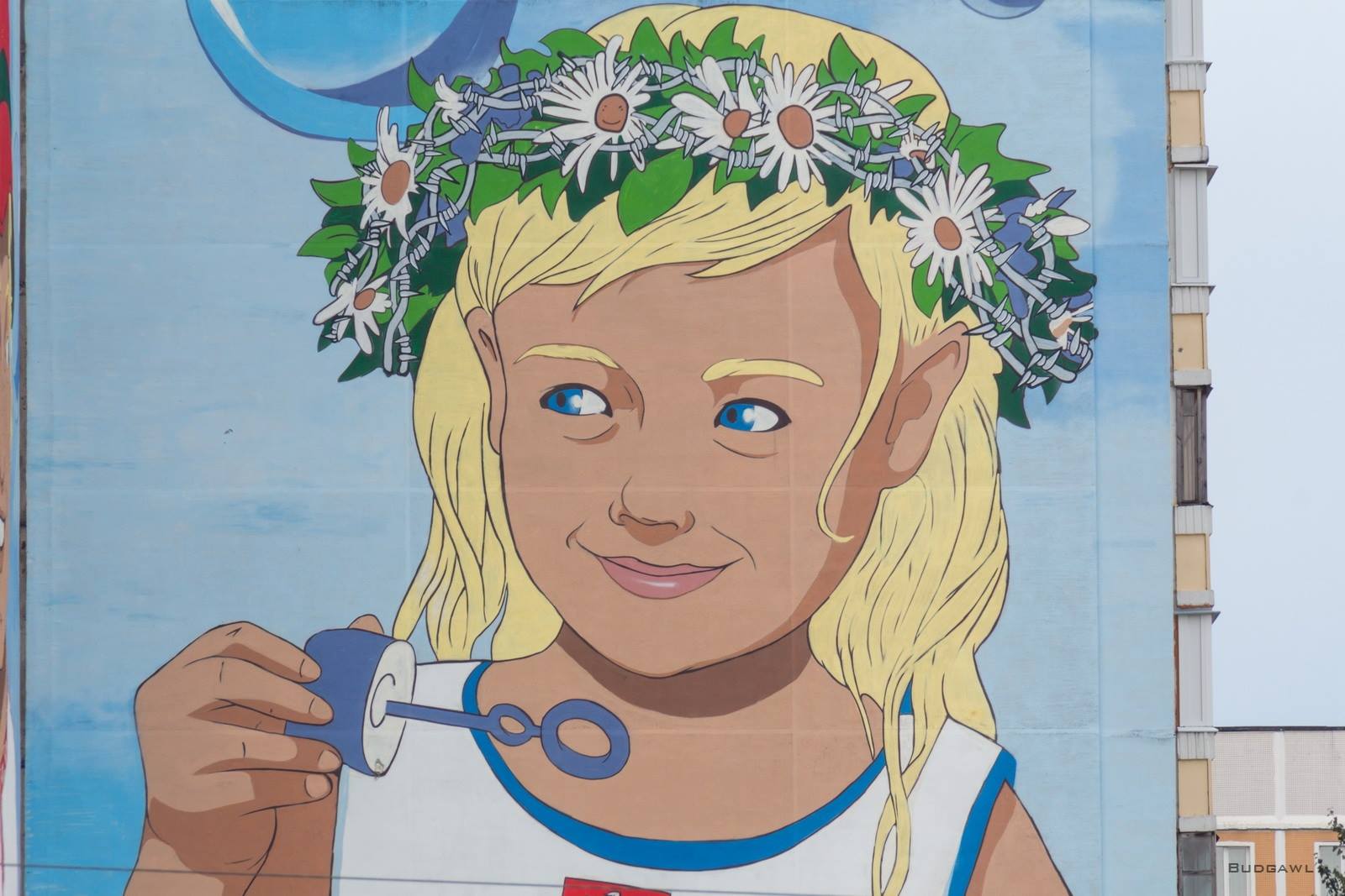 На графіті зображені хлопчик і дівчинка, які символізують Мінськ і Москву відповідно. В руках у хлопчика букет з ромашок і волошок. Такі ж квіти прикрашають вінок на голові дівчинки. Саме в квіткові композиції й було додано колючий дріт.