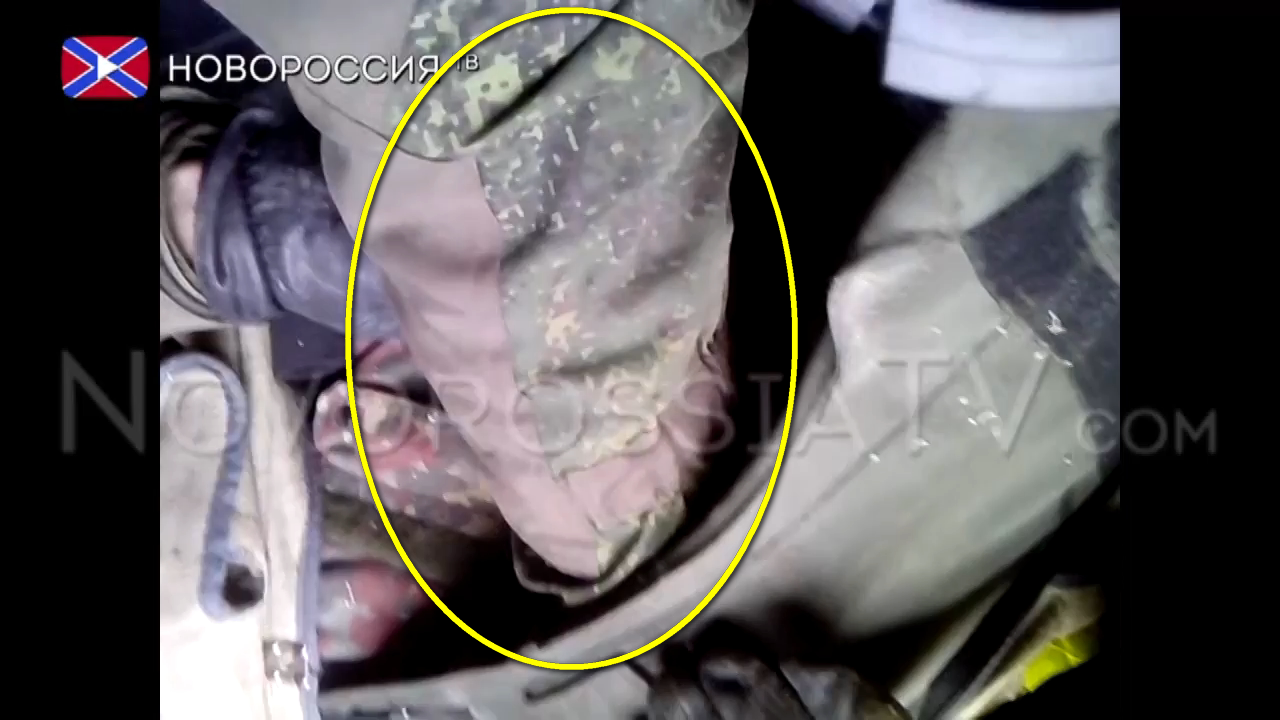 В видеоряде были фото-вставки событий 9 февраля 2015. Все фото найдены и будут разобраны подробнее ниже в статье. Продолжаем идентификацию того, кто вел съемку в кузове грузовика. Предпочтение для анализа событий, происходящих в кузове, было отдано видео "Подвиг Легиона", т.к. там качество интересующих кадров оказалось лучше, чем на том видео, которое было выложено в соцсети ВК. Красным цветом отмечена белая повязка на нижней части правой ноги. Желтым - темно зеленый цвет формы "Горка". Голубым отмечена разорванная с внутренней части левая штанина формы. Вышеуказанные особенности одежды полностью совпадают на кадрах в видео и на фото из альбома Романа Назарова, где он и другие российские оккупанты фотографируются на фоне четырех лежащих на земле украинских военных", - отмечают авторы расследования.
