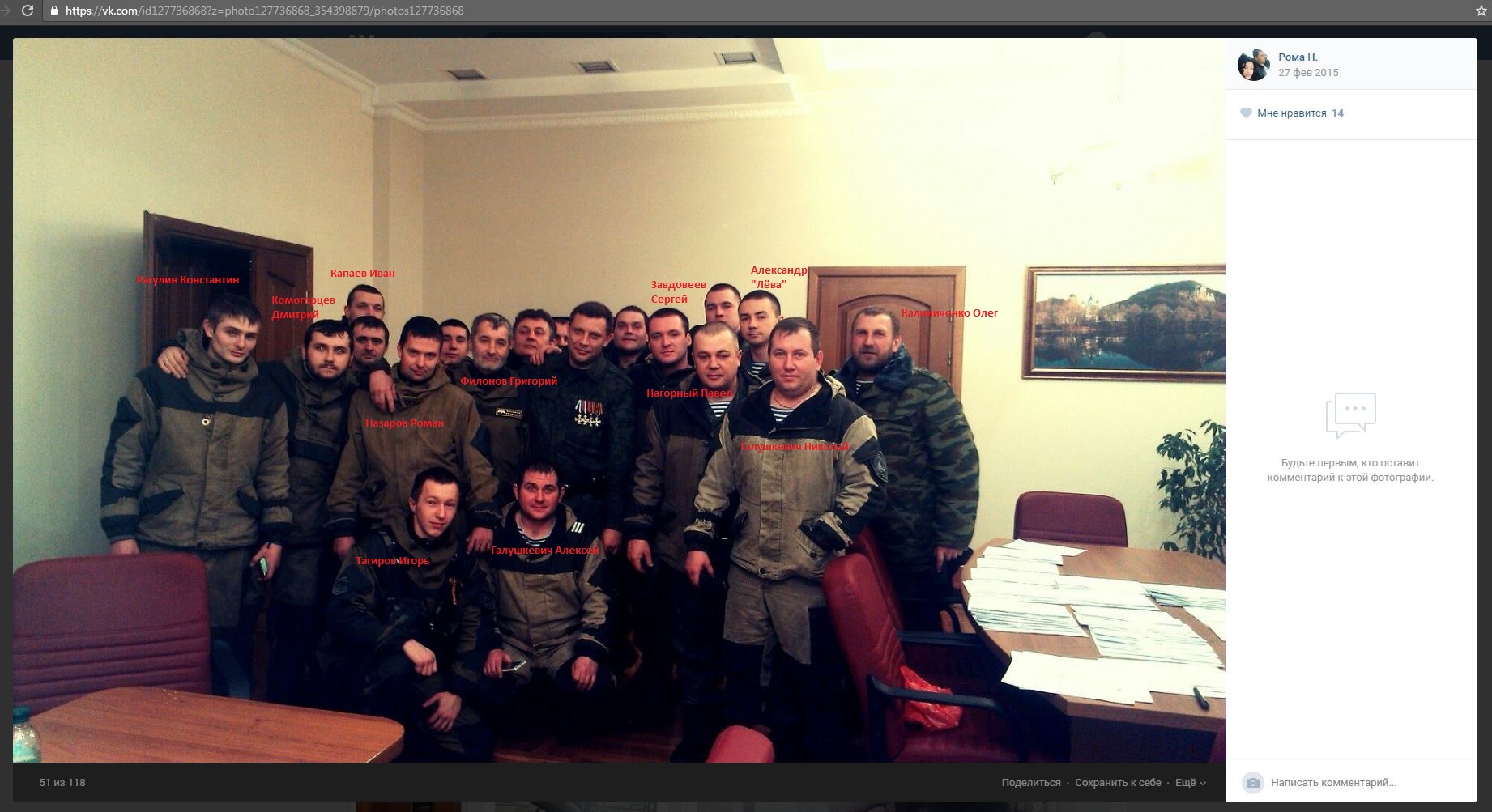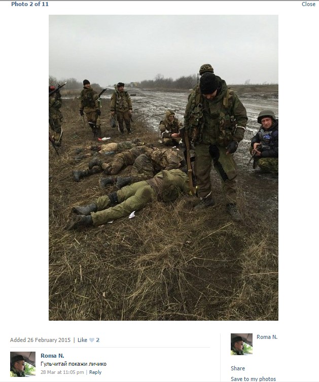 26-го февраля 2015 Роман Назаров под видео добавил фото, где он и другие российские оккупанты фотографируются на фоне четырех лежащих на земле украинских военных.