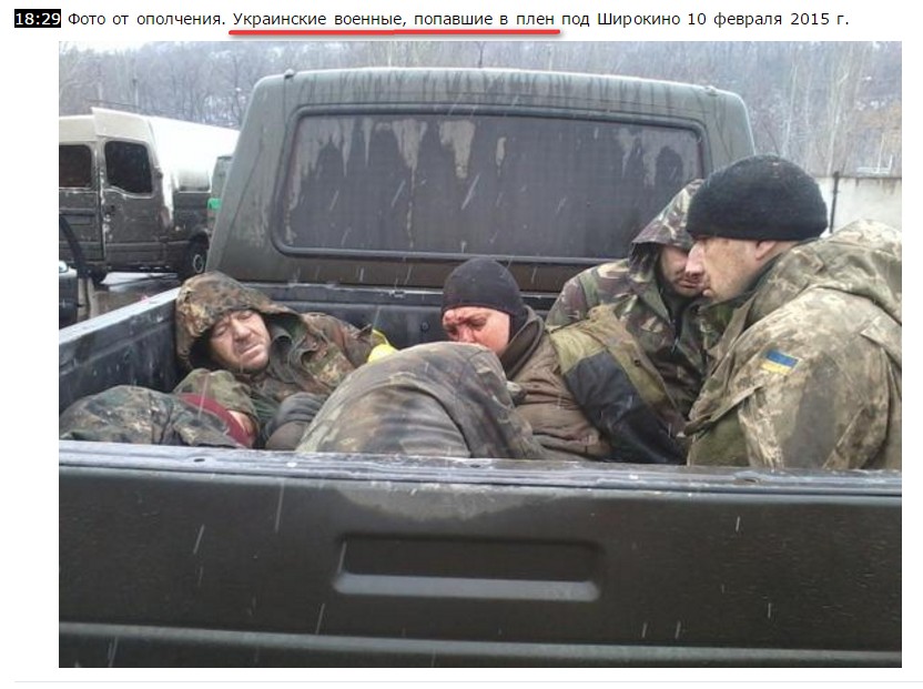 Забегая вперед, отметим, что на разных российских сайтах, ведущих так называемую " оперативную информацию с фронтов "ДНР" и "ЛНР" и военные сводки от "вооруженных сил Новороссии" в своей "хронике военных событий в Новороссии за 10.02.2015″ было опубликовано фото с подписью "18:29 Фото от ополчения. Украинские военные, попавшие в плен под Широкино 10 февраля 2015 г.". В марте 2015-го родственники опознали своих родных, находившихся в кузове.