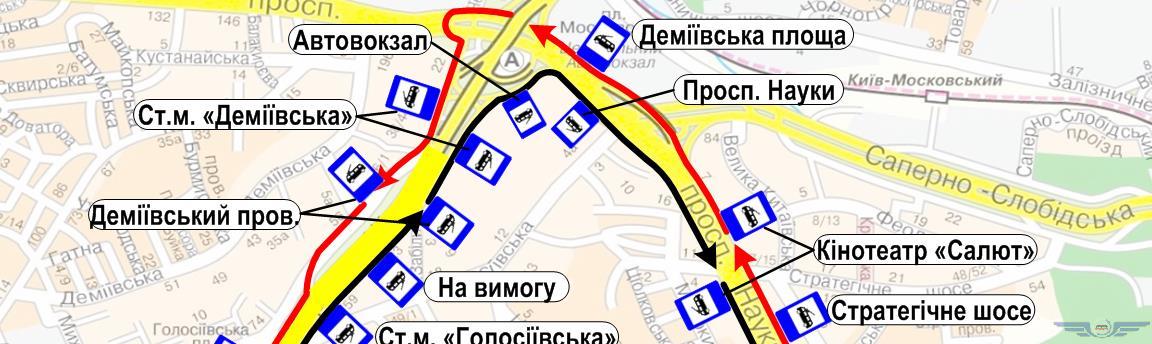 - автобусів маршрутів №№ 20,27,52,91 по проспекту Науки в напрямку ст.м.Либідська;