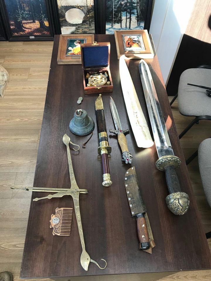 У ході огляду транспортного засобу в одному з ящиків, в якому згідно з описом, перевозилися плафони, було виявлено 3 мисливські ножі, старовинний меч, бивень слона, старовинні ваги, датовані 1823 роком, дзвін, датований 1816 роком, корабельний компас 18 століття, старовинні ґудзики, годинник і картини.